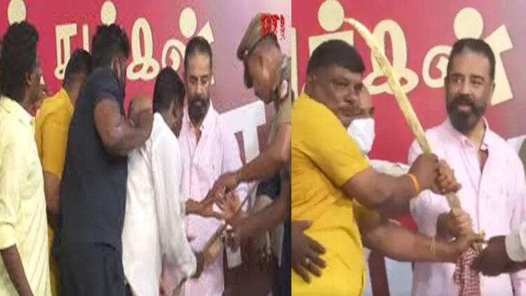 VIDEO | Chennai: Actor and MNM Chief Kamal Haasan (@ikamalhaasan) gets angry at man who gifts him a sword during party meeting.#KamalHaasan_MP