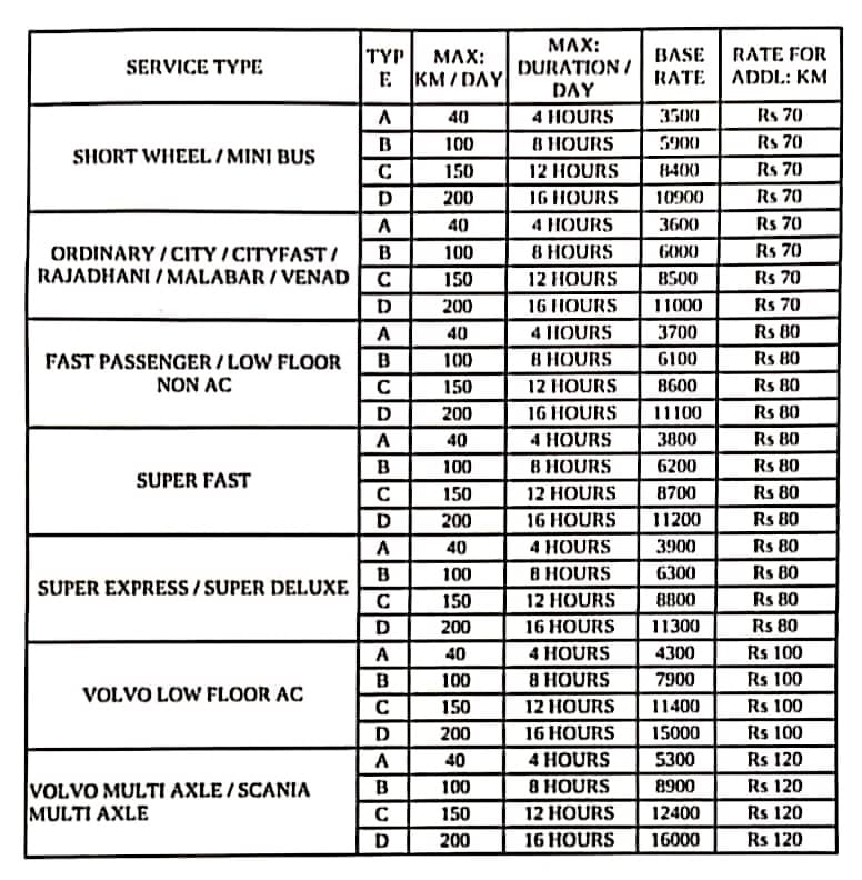 നാല് മണിക്കൂറിന് ഓർഡിനറി ബസാണെങ്കിൽ 3600 രൂപയാണ്. പഴയ വാടക പ്രകാരം നാല് മണിക്കൂറിന് ഓർഡിനറി ബസിന് 8500 രൂപയും ഫാസ്റ്റ് പാസഞ്ചറിന് 9000 രൂപയും സൂപ്പർ ഫാസ്റ്റ് 9500 രൂപയും സൂപ്പർ എക്സ്പ്രസിന് 10000 രൂപയും വോൾവോയ്‌ക്ക് 13000 രൂപയുമായിരുന്നു. ജിഎസ് ടി അതിന് പുറമേ നൽകണമായിരുന്നു. 40 കിലോമീറ്റർ എന്നത് ട്രിപ്പ് പോയി തിരിച്ചുവരുന്ന ദൂരമാണ്. അധികമായി വരുന്ന ഓരോ കിലോമീറ്ററിന് ബസിന്റെ ക്ലാസ് അനുസരിച്ചുള്ള തുകയും ജിഎസ് ടിയും നൽകണം. ചാർട്ടേഡ് ട്രിപ്പുകൾ സംബന്ധിച്ച വിശദമായ നിരക്കുവിവരങ്ങൾ ചുവടെ നൽകിയിട്ടുള്ള പട്ടികയിൽ ചേർക്കുന്നു.