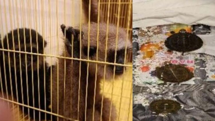 ചെന്നൈ: വംശനാശഭീഷണി നേരിടുന്ന വ്യത്യസ്തയിനം കുരങ്ങുകളും ആമകളുമായി ബാങ്കോക്കിൽ നിന്നെത്തിയ യുവാവ് ചെന്നൈ വിമാനത്താവളത്തിൽ പിടിയിലായി. കാരിബാ​ഗുകളിൽ ഒളിപ്പിച്ച നിലയിൽ രണ്ട് കുരങ്ങുകളും ഏഴ് ആമകളുമാണ് പിടികൂടിയത്. യുവാവിനെ അറസ്റ്റ് ചെയ്ത് കോടതിയിൽ ഹാജരാക്കുകയും മൃ​ഗങ്ങളെ തായ്ലാൻ‍ഡിലേക്ക് തിരിച്ചയയ്‌ക്കുകയും ചെയ്തു.