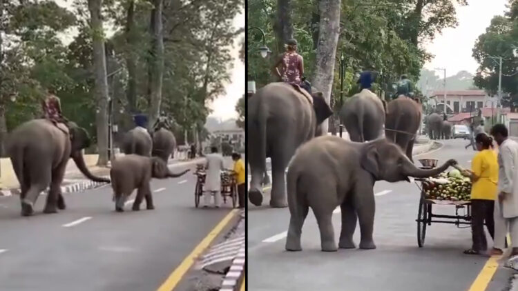 വിരമിച്ച ഇന്ത്യൻ ഫോറസ്റ്റ് സർവീസ് ഓഫീസർ സുശാന്ത നന്ദയാണ് ഈ ഹൃദയസ്പർശിയായ വീഡിയോ എക്‌സിൽ പോസ്റ്റ് ചെയ്തത്. റോഡിൽ ഒരുകൂട്ടം കൊമ്പനാനകൾക്കൊപ്പം അവരുടെ പിന്നിലായി നടക്കുന്ന കുഞ്ഞനാനയെ വീഡിയോയിൽ കാണാം. പോകുന്ന വഴിക്ക് കാണുന്ന പഴക്കച്ചവടക്കാരന്റെ വണ്ടിയിൽ അവന്റെ കണ്ണുകൾ ഉടക്കി. പിന്നെ റൂട്ട് മാറ്റി അവിടെയെത്തി. തുമ്പികൈകൾ നീട്ടി അവിടെയിരുന്ന കരിമ്പിൻ കഷ്ണം നൽകാൻ കടക്കാരനോട് ആവശ്യപ്പെട്ടു. അവന്റെ ഭാഷ മനസിലായിട്ടെന്നോണം അവിടെ നിന്ന സ്ത്രീ ഒരു കരിമ്പിൻ കഷ്ണമെടുത്ത് അവന്റെ തുമ്പിക്കയ്യിൽ വച്ച് നൽകി. കുട്ടിയാന അതുമായി മറ്റ് ആനകൾക്കൊപ്പം നടന്നു നീങ്ങി.