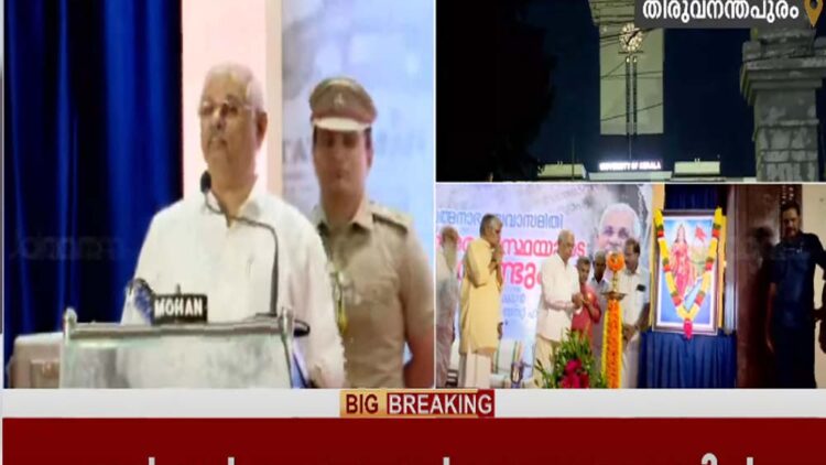 തിരുവനന്തപുരം: എസ്എഫ്ഐ കെ.എസ്.യു സംഘടനകളുടെ പ്രതിഷേധത്തിന് പുല്ലുവില നൽകി കേരള സർവകലാശാലയിൽ സംഘടിപ്പിച്ച ചടങ്ങിൽ ഭാരതാംബയുടെ ചിത്രത്തിൽ പുഷ്പാർച്ചന നടത്തി, വിളക്കു കൊളുത്തി ഗവർണർ രാജേന്ദ്ര അർലേക്കർ. അടിയന്തരാവസ്ഥ പ്രഖ്യാപനത്തിന്റെ അമ്പതാം വാർഷികത്തോടനുബന്ധിച്ച് സെനറ്റ് ഹാളിൽ ശ്രീപത്മനാഭ സേവാസമിതിയാണ് ചടങ്ങ് സംഘടിപ്പിച്ചത്. ചടങ്ങിൽ ഭാരതാംബയുടെ ചിത്രം വച്ചതിന് പിന്നാലെയാണ് എസ്എഫ്ഐ പ്രതിഷേധവുമായി രംഗത്തുവന്നത്.