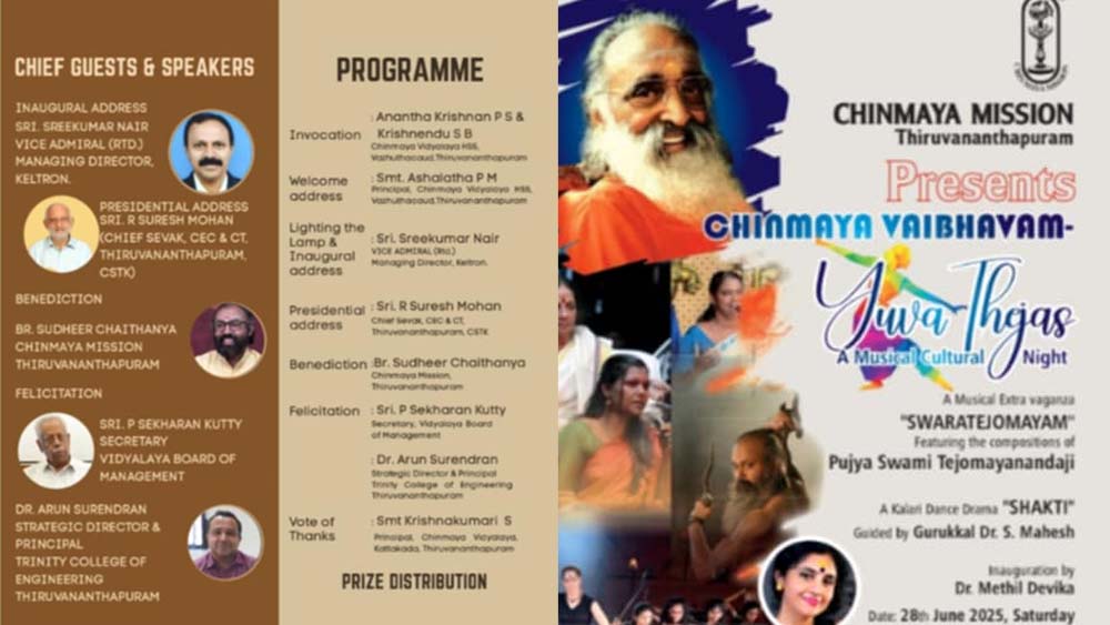 വൈകിട്ട് അഞ്ച് മണിക്ക് ചിന്മയ വിദ്യാലയങ്ങളിലെ അദ്ധ്യാപകരും വിദ്യാര്‍ത്ഥികളും ചിന്മയ മിഷന്‍ കലാകാരന്മാരും അവതരിപ്പിക്കുന്ന ചിന്മയ വൈഭവം യുവ തേജസ് എന്ന സാസ്‌കാരിക പരിപാടി അരങ്ങേറും. നർത്തകിയും നടിയുമായ മേതില്‍ ദേവികയാണ് പരിപാടിയുടെ ഉദ്ഘാടനം നിര്‍വഹിക്കുന്നത്. വാര്‍ത്താ സമ്മേളനത്തില്‍ കുന്നുംപുറം ചിന്മയ വിദ്യാലയം പ്രിന്‍സിപ്പല്‍ ബീന എന്‍ ആര്‍, അദ്ധ്യാപിക പ്രേമിനി എസ് എന്നിവര്‍ പങ്കെടുത്തു.