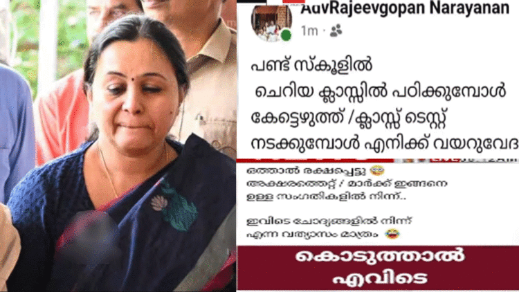 ‘കുട്ടിയായിരിക്കുമ്പോൾ ക്ലാസ് പരീക്ഷ/ കേട്ടെഴുത്ത് ദിവസം വയറുവേദനയെന്ന് പറഞ്ഞ് വീട്ടിൽ ഇരിക്കുമായിരുന്നു. അവിടെ ഉത്തരങ്ങളിൽ നിന്നും രക്ഷപ്പെട്ടു. ഇവിടെ ചോദ്യങ്ങളിൽ നിന്നും’… എന്നിങ്ങനെ പോകുന്നു പരിഹാസം. കോട്ടയം മെഡിക്കൽ കോളേജിലുണ്ടായ അപകടത്തിന്  പിന്നാലെ മന്ത്രി വീണ ജോർജ് ദേഹാസ്വസ്ഥ്യം അനുഭവപ്പെട്ട് ചികിത്സ തേടിയിരുന്നു. ഇതിനെയാണ് സിപിഎം ഇരവിപേരൂർ ഏരിയ കമ്മിറ്റിയം​ഗം കൂടിയായ രാജീവ് പരിഹസിച്ചത്.