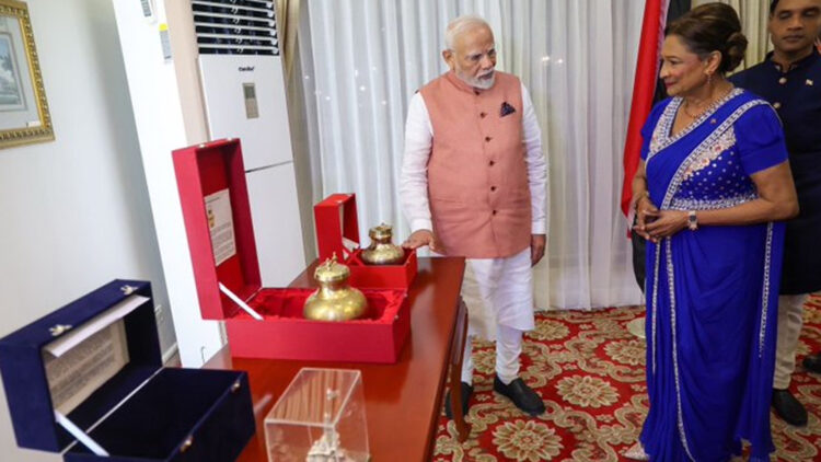 പോർട്ട് ഓഫ് സ്പെയിൻ: ട്രിനിഡാഡ് ആൻഡ് ടൊബാഗോ പ്രധാനമന്ത്രിക്ക് ഇന്ത്യയിൽ നിന്നെത്തിച്ച വിശിഷ്ട വസ്തുക്കൾ സമ്മാനിച്ച് പ്രധാനമന്ത്രി നരേന്ദ്രമോദി. മഹാകുംഭത്തിൽ നിന്നുള്ള ത്രിവേണീ സംഗമത്തിലെയും സരയൂ നദിയിലെയും പുണ്യ ജലവും അയോധ്യയിലെ രാമക്ഷേത്രത്തിന്റെ മാതൃകയുമാണ് മോഡി ട്രിനിഡാഡ് ആൻഡ് ടൊബാഗോ പ്രധാനമന്ത്രി കമല പെർസാദ്-ബിസെസ്സറിന് സമ്മാനിച്ചത്.
