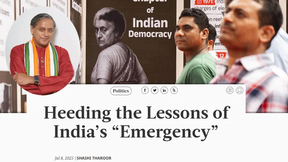 അടിയന്തരാവസ്ഥ ഇന്ത്യയുടെ ചരിത്രത്തിലെ ഇരുണ്ട അദ്ധ്യായമാണെന്ന് തരൂർ പറഞ്ഞു. രാജ്യത്ത് 21 മാസത്തോളം മൗലികാവകാശങ്ങൾ റദ്ദാക്കപ്പട്ടു. മാദ്ധ്യമങ്ങളുടെ വായമൂടിക്കെട്ടി, രാഷ്ട്രീയ വിയോജിപ്പുകൾ ക്രൂരമായി അടിച്ചമർത്തപ്പെട്ടു, അടിയന്തരാവസ്ഥയിൽ ഇന്ദിരയുടെ മകൻ നടത്തിയത് നരനായാട്ടാണെന്നും ലേഖനത്തിൽ ചൂണ്ടിക്കാട്ടുന്നു. ഇന്ദിര ഗാന്ധിയുടെ മകൻ സഞ്ജയ് നയിച്ച നിർബന്ധിത വന്ധീകരണ പരിപാടികൾ അതിനുള്ള ഉദാഹരണമാണ്. കർക്കശ നടപടികൾ ഇന്ദിരയുടെ നിർബന്ധപ്രകാരമായിരുന്നു.