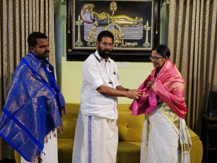 തിരുവനന്തപുരം:ശ്രീ പത്മനാഭസ്വാമി ക്ഷേത്രത്തിന്റെ കനത്ത സെക്യൂരിറ്റി സംവിധാനത്തിന്റെ കണ്ണ് വെട്ടിച്ച് മെറ്റ കണ്ണട ധരിച്ച് ക്ഷേത്രത്തിനുള്ളിൽ കടന്ന ഗുജറാത്ത് സ്വദേശിയെ പിടികൂടിയ രണ്ട് ക്ഷേത്രം ജീവനക്കാരെ ബിജെപി ആദരിച്ചു. ബിജെപി തിരുവനന്തപുരം (സെന്ട്രല്) ജില്ലാപ്രസിഡന്റ് കരമന ജയനാണ് ഇവരെ പൊന്നാട അണിയിച്ച് ആദരിച്ചത്.