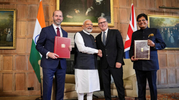 ന്യൂഡൽഹി: ഇന്ത്യയും യുകെയും സ്വതന്ത്ര വ്യാപാര കരാറിൽ (FTI) ഒപ്പുവച്ചു. ലണ്ടനിൽ പ്രധാനമന്ത്രി മോദിയും ബ്രിട്ടീഷ് പ്രധാനമന്ത്രി മന്ത്രി കെയർ സ്റ്റാർമറും നടത്തിയ ഉഭയകക്ഷി ചർച്ചകൾക്ക് ശേഷമാണ് വാണിജ്യ മന്ത്രി പീയൂഷ് ഗോയലും യുകെയുടെ ബിസിനസ് ആൻഡ് ട്രേഡ് സ്റ്റേറ്റ് സെക്രട്ടറി ജോനാഥൻ റെയ്നോൾഡ്സും കരാറിൽ ഒപ്പുവച്ചത്.