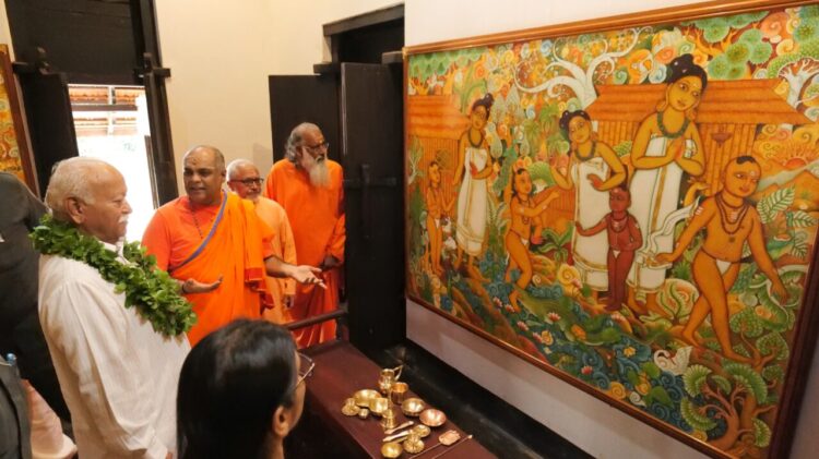 ചിന്മയ മിഷൻ കേരള സംയോജകൻ സ്വാമി വിവിക്താനന്ദ, ചിന്മയ ഇൻ്റർനാഷണൻ ഫൗണ്ടേഷൻ ആചാര്യൻ സ്വാമി ശാരദാനന്ദ ,ചിന്മയ മിഷൻ നോയിഡ ആചാര്യൻ സ്വാമി ചിത് രൂപാനന്ദ എന്നിവർ ചേർന്ന് സ്വീകരിച്ചു. ശങ്കരാചാര്യർ ജനിച്ച മുറിയിൽ സർസംഘചാലക് ദീപാരാധനയും നടത്തി. ജീവചരിത്രം ആലേഖനം ചെയ്ത മ്യൂറൽ ചിത്രങ്ങളും വീക്ഷിച്ചു.