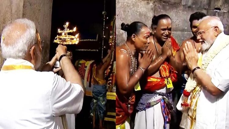 പരമ്പരാഗത വസ്ത്രം ധരിച്ച് ക്ഷേത്രഇടനാഴിയിലൂടെ നടക്കുന്ന പ്രധാനമന്ത്രിയുടെ വീഡിയോ പുറത്തുവന്നു. ക്ഷേത്രത്തിൽ ദീപാരാധന നടത്തുകയും പ്രത്യേക പൂജകളിൽ പങ്കെടുക്കുകയും ചെയ്തു. ചോള ശൈവിസത്തെയും വാസ്തുവിദ്യയെയും കുറിച്ച് ആർക്കിയോളജിക്കൽ സർവേ ഓഫ് ഇന്ത്യ സംഘടിപ്പിച്ച ഒരു പ്രദർശനവും പ്രധാനമന്ത്രി സന്ദർശിച്ചു.