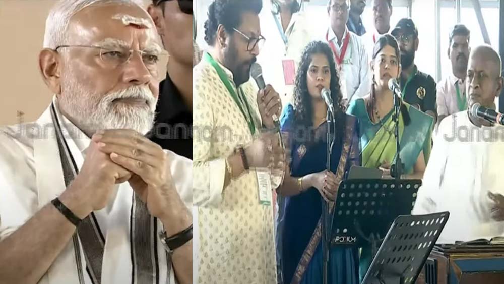 ചെന്നൈ: രണ്ട് ദിവസത്തെ സന്ദർശനത്തിനായി തമിഴ്നാട്ടിലെ തിരുച്ചിരപ്പള്ളിയിലെത്തിയ പ്രധാനമന്ത്രി നരേന്ദ്രമോദിക്ക് സംഗീത വിരുന്നൊരുക്കി ഇളയരാജയും മധു ബാലകൃഷ്ണനും. തിരുച്ചിറപ്പള്ളിയിലെ ഗംഗൈകൊണ്ട ചോളപുരം ക്ഷേത്രത്തിലാണ് പ്രധാനമന്ത്രിക്ക് വേണ്ടി പ്രത്യേക സംഗീതവിരുന്ന് ഒരുക്കിയത്. നിരവധി പേരാണ് സംഗീത വിരുന്നിൽ പങ്കാളികളായത്. അതിമനോഹരമായ സംഗീതാർച്ചനയ്ക്ക് നേതൃത്വം നൽകിയത് ഇളയരാജയായിരുന്നു.