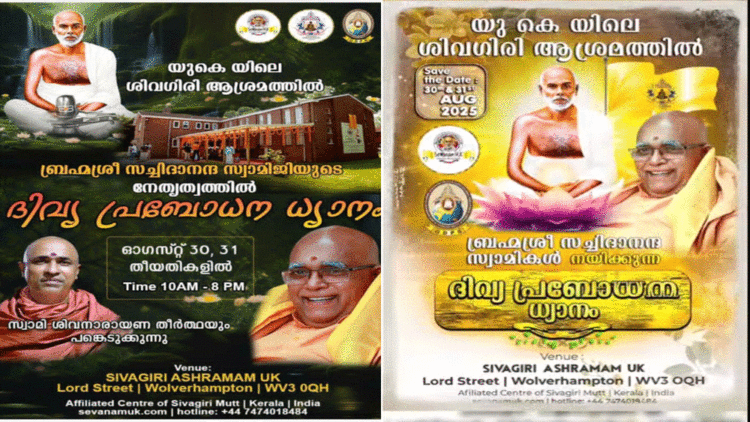 യുകെ യിലെ ശിവഗിരി ആശ്രമം, ഗുരുദേവ ഭക്തർക്കായി ദിവ്യമായൊരു ആത്മീയാനുഭവത്തിന് വേദിയാകുന്നു. ഓഗസ്റ്റ് 30, 31 (ശനി, ഞായർ) തീയതികളിൽ ശ്രീനാരായണ ധർമ്മസംഘം ട്രസ്റ്റ് ബോർഡ് പ്രസിഡന്റ് ബ്രഹ്മശ്രീ സച്ചിദാനന്ദ സ്വാമിജിയുടെ നേതൃത്വത്തിൽ ദിവ്യ പ്രബോധന ധ്യാനം നടക്കും. ശിവനാരായണ തീർത്ഥ സ്വാമിയും പരിപാടിയിൽ പങ്കെടുക്കും.