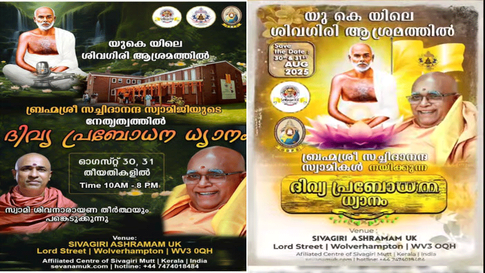 യുകെ യിലെ ശിവഗിരി ആശ്രമം, ഗുരുദേവ ഭക്തർക്കായി ദിവ്യമായൊരു ആത്മീയാനുഭവത്തിന് വേദിയാകുന്നു. ഓഗസ്റ്റ് 30, 31 (ശനി, ഞായർ) തീയതികളിൽ ശ്രീനാരായണ ധർമ്മസംഘം ട്രസ്റ്റ് ബോർഡ് പ്രസിഡന്റ് ബ്രഹ്മശ്രീ സച്ചിദാനന്ദ സ്വാമിജിയുടെ നേതൃത്വത്തിൽ ദിവ്യ പ്രബോധന ധ്യാനം നടക്കും. ശിവനാരായണ തീർത്ഥ സ്വാമിയും പരിപാടിയിൽ പങ്കെടുക്കും.