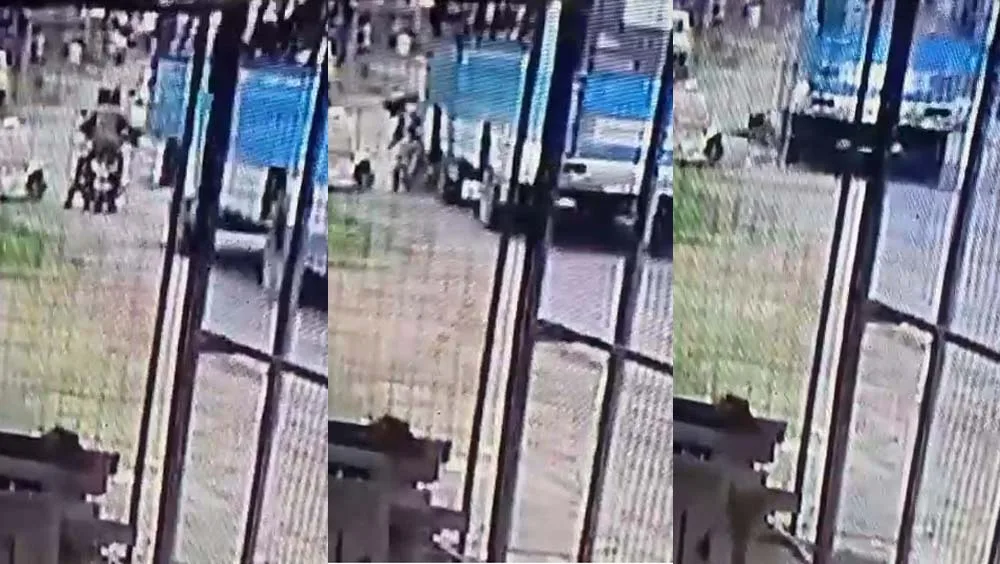 റോഡരികിൽ പാർക്ക് ചെയ്ത ബൈക്കിൽ ഇരുന്ന യാത്രക്കാരെ സ്വകാര്യ ബസ്സ് ഇടിച്ചു വീഴ്‌ത്തി