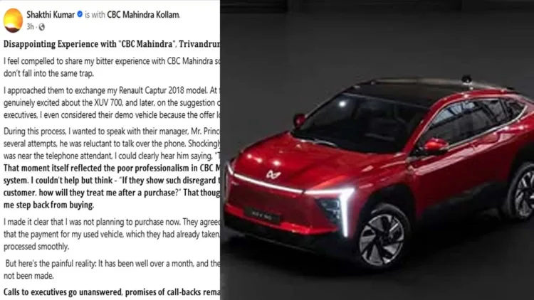 കാർ ഡീലറായ സിബിസി മഹീന്ദ്രയിൽ നിന്ന് നേരിടേണ്ടിവന്ന ദുരനുഭവം തുറന്നുപറഞ്ഞ് ഉപഭോക്താവ്. തിരുവനന്തപുരത്ത് പ്രവർത്തിക്കുന്ന സിബിസി മഹീന്ദ്രയിൽ നിന്നാണ് ശക്തികുമാർ എന്ന ഉപഭോക്താവിന് മോശം അനുഭവമുണ്ടായത്. താൻ അപമാനിക്കപ്പെട്ടുവെന്നും തനിക്കുണ്ടായ വിശ്വാസം തകർന്നുവെന്നും ശക്തികുമാർ ഫെയ്സ്ബുക്കിൽ കുറിച്ചു.