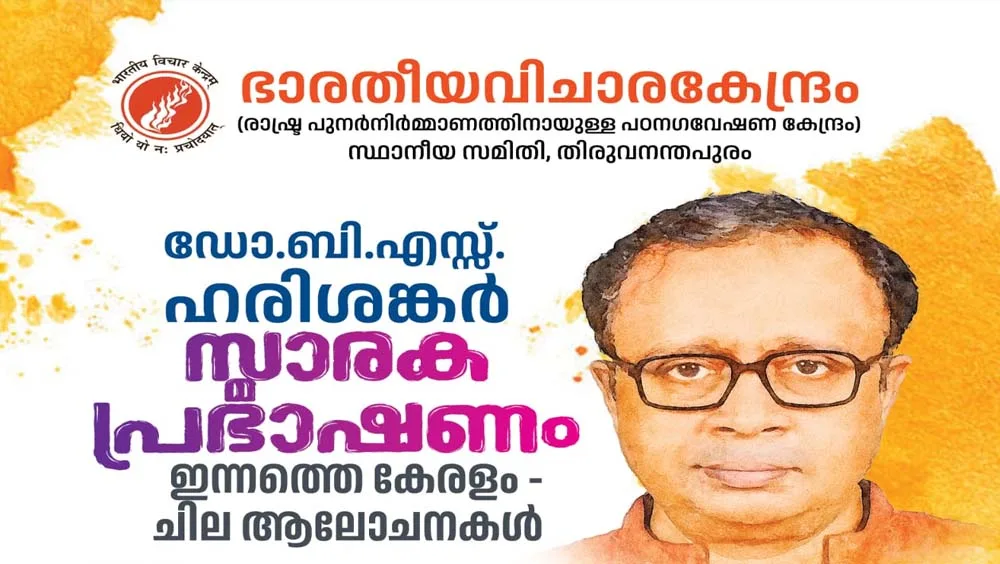ഭാരതീയവിചാരകേന്ദ്രത്തിന്റെ ആഭിമുഖ്യത്തിൽ സംഘടിപ്പിക്കുന്ന പരിപാടിയിൽ “ഇന്നത്തെ കേരളം – ചില ആലോചനകൾ” എന്ന വിഷയത്തിലാണ് പ്രഭാഷണം. ഭാരതീയവിചാരകേന്ദ്രം ഡയറക്ടർ ശ്രീ. ആർ.സഞ്ജയൻ അദ്ധ്യക്ഷത വഹിക്കും