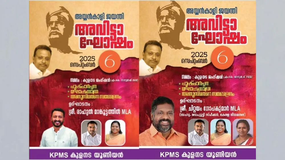 പത്തനംതിട്ട: അയ്യങ്കാളി ജയന്തി അവിട്ടാഘോഷ പരിപാടിയിൽ നിന്നും രാഹുൽ മാങ്കൂട്ടത്തിൽ എം എൽ എ യെ മാറ്റി.സെപ്തംബര് ആറിന് നടത്താനിരിക്കുന്ന പരിപാടിയില് നിന്നാണ് രാഹുല് മാങ്കൂട്ടത്തിലിനെ ഒഴിവാക്കിയത്. ഈ പരിപാടിയുടെ ഉദ്ഘാടന ചുമതലയായിരുന്നു രാഹുലിന് നിശ്ചയിച്ചിരുന്നത്. ഡെപ്യൂട്ടി സ്പീക്കര് ചിറ്റയം ഗോപകുമാറിനാണ് പകരം ഉദ്ഘാടന ചുമതല. ചിറ്റയം ഗോപകുമാറിനെ ഉദ്ഘാടകനാക്കി പുതിയ പോസ്റ്റര് പുറത്തിറക്കി.
