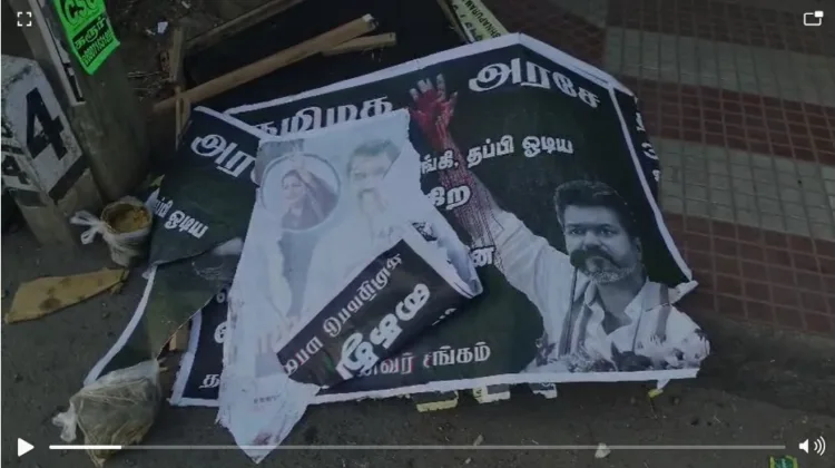 ആൾക്കൂട്ടദുരന്തമുണ്ടാക്കി ഒളിച്ചോടിയ രാഷ്ട്രീയ നേതാവ്: വിജയ്‌ക്കെതിരെയുള്ള പോസ്റ്ററുകൾ വ്യാപകമായി നശിപ്പിച്ചു