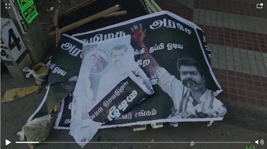 ആൾക്കൂട്ടദുരന്തമുണ്ടാക്കി ഒളിച്ചോടിയ രാഷ്ട്രീയ നേതാവ്: വിജയ്‌ക്കെതിരെയുള്ള പോസ്റ്ററുകൾ വ്യാപകമായി നശിപ്പിച്ചു