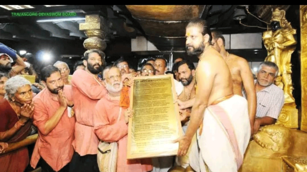 തിരുവനന്തപുരം: അയ്യപ്പന്റെ ഉറക്കുപാട്ടായ ഹരിവരാസനം ആലേഖനം ചെയ്ത സ്വർണ ഫലകവും മോഷ്ടിച്ചെന്ന് സംശയം. 2014ൽ ദുബായ് അയ്യപ്പ സേവാ സമിതിയാണ് ശബരിമലയിൽ സ്വർണ ഫലകം സമർപ്പിച്ചത്. കൃഷ്ണദാസ് നമ്പൂതിരി മേൽശാന്തി സ്വർണ ഫലകം ശ്രീകോവിലിന് മുന്നിൽ വച്ച് ഏറ്റുവാങ്ങുന്ന ചിത്രങ്ങൾ പുറത്തുവന്നിട്ടുണ്ട്. .