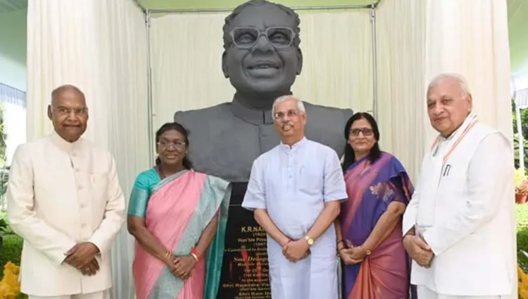 തിരുവനന്തപുരം: നാല് ദിവസത്തെ സന്ദർശനത്തിനായി കേരളത്തിലെത്തിയ രാഷ്‌ട്രപതി ദ്രൗപദി മുർമു മുൻ രാഷ്‌ട്രപതി കെ ആർ നാരായണന്റെ പ്രതിമ അനാച്ഛാദനം ചെയ്തു. പ്രതിമ അനാവരണം ചെയ്ത ശേഷം രാഷ്‌ട്രപതി പുഷ്പാർച്ചന നടത്തി. മുൻ രാഷ്‌ട്രപതി റാംനാഥ് ​കോവിന്ദ്, ​ഗവർണർ രാജേന്ദ്ര അർലേക്കർ, മുൻ ​ഗവർണർ ആരിഫ് മുഹമ്മദ് ഖാൻ എന്നിവർ അനാവരണ ചടങ്ങിൽ പങ്കെടുത്തു.