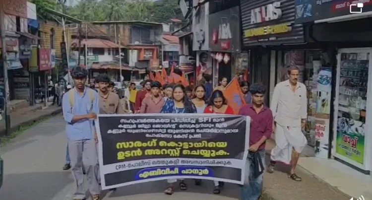 പോക്സോ കേസ് പ്രതിയായ മുൻ കണ്ണൂർ യൂണിവേഴ്സിറ്റി യൂണിയൻ ചെയർമാൻ സാരംഗ് കോട്ടായിയെ അറസ്റ്റ് ചെയ്യാൻ വൈകുന്നതിൽ പോലീസിന്റെ ഒത്തുകളി; എബിവിപി പാനൂർ പോലീസ് സ്റ്റേഷനിലേക്ക് മാർച്ച് നടത്തി.