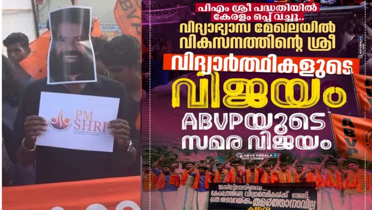 കഴിഞ്ഞ ദിവസം വിദ്യാഭ്യാസ മന്ത്രി വി ശിവന്കുട്ടിക്ക് അഭിനന്ദനം അറിയിച്ച് എബിവിപി നേതാക്കള് കുറിപ്പ് പങ്കുവച്ചിരുന്നു. പിഎം ശ്രീ പദ്ധതിയില് ഒപ്പുവെച്ചതിന് എബിവിപി സംസ്ഥാന സെക്രട്ടറി ഇ യു ഈശ്വരപ്രസാദിന്റെ നേതൃത്വത്തിലുള്ള സംഘം മന്ത്രിയുടെ ഓഫീസില് നേരിട്ടെത്തി അഭിനന്ദനമറിയിക്കുകയും ചെയ്തു.