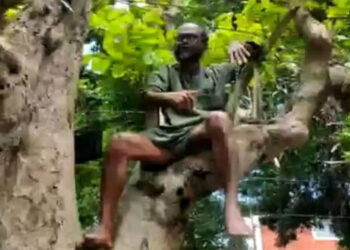 മരത്തിൽ കയറി സ്വയം ചങ്ങലകെട്ടി; തെരുവ് നായ ശല്യത്തിൽ വേറിട്ട പ്രതിഷേധം