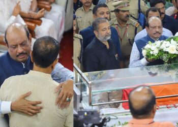 വി.എസ് അച്യുതാനന്ദന് അന്ത്യാജ്ഞലി അർപ്പിച്ച് എം എ യൂസഫലി; മകൻ അരുൺ കുമാറിനെ ചേർത്ത് പിടിച്ച് ആശ്വസിപ്പിച്ചു