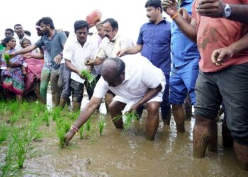 “നാമെല്ലാം ഭൂമി മാതാവിന്റെ മക്കളാണ്”: പാടത്ത് നെൽകൃഷിയിറക്കി കേന്ദ്ര സ്റ്റീൽ ഘനവ്യവസായ മന്ത്രിഎച്ച് ഡി കുമാരസ്വാമി