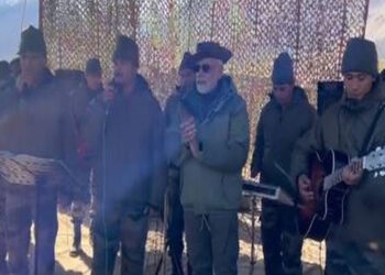 സൈനികരുടെ ദീപാവലി ആഘോഷത്തിൽ പങ്കുചേർന്ന് പ്രധാനമന്ത്രി; ഗിത്താറിന്റെ അകമ്പടിയിൽ വന്ദേ മാതരം ആലപിച്ച് നരേന്ദ്ര മോദി -PM  joins sing-along with soldiers in Kargil on Diwali