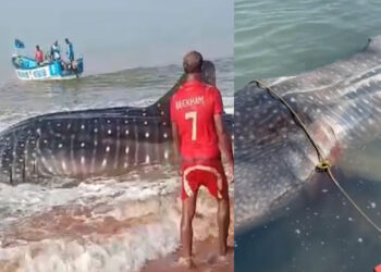 കൊച്ചുവേളിയിൽ കൂറ്റൻ തിമിംഗല സ്രാവുകൾ വലയിൽ കുടുങ്ങി, ഒരെണ്ണം കരയ്ക്കടിഞ്ഞു