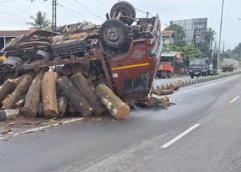 റോഡ് ഇടിഞ്ഞു; നഗരസഭാ ചെയർമാന്റെ വീടിന് മുകളിലേക്ക് സിമന്റെ് ലോറി മറിഞ്ഞു