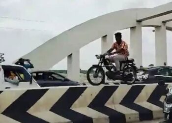 തിരക്കേറിയ റോഡിൽ ഡിവൈഡറിന് മുകളിലൂടെ ബൈക്ക് ഓടിച്ച് യുവാവ്; അതിരുകടന്ന അഭ്യാസം, വീഡിയോ