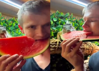 യുവാവിനൊപ്പം തണ്ണിമത്തൻ പങ്കിട്ട് കഴിച്ച് ഇഗ്വാന ; വീഡിയോ വൈറൽ